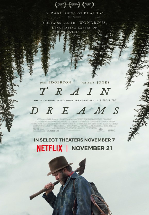 During his early years in the Pacific Northwest during the first half of the 20th century, Robert (Joel Edgerton, in perhaps his best performance) lives an unfulfilled and empty life, until he meets his wife (Felicity Jones), with whom he has a daughter. But after they are both killed in a devastating forest fire, Robert is adrift and alone, haunted by their deaths and his disturbing experiences as a railway worker. Though he manages to find some perspective or meaning in the meaningless toward the end of the film, Train Dreams is that rare movie exploring a person whose life never amounts to much. No big dreams. No major accomplishments. Just existence.